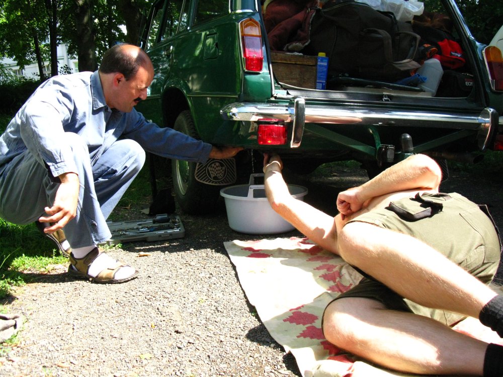 V pátek se vstávalo ještě před kuropěním, zbývalo jen naložit věci a natankovat. Po dálnici do Prahy byla cesta pohodlná, myslím tedy co se slabého provozu na ní týče, sluníčko svítilo a na místě srazu s Viktorem v Teplicích jsme byli po necelých třech a půl hodinách jízdy. Tak jsme se shledali, a na parkovišti jsme shledali, že nám vzadu z auta něco kape. Bože… vždyť… je… to… benzín!!! Ano, již po cestě od Prahy do kabiny párkrát zavanul jeho pach. Spodní pryžové koleno od palivové nádrže asi už neudrželo neobvyklý tlak až po špunt plné a začalo porézní gumou trochu propouštět. Tož jet a dojet by se s tím asi dalo, ale určitě ne na teprve nadcházející pobyt v Německu! Štěstí a počasí ale stálo při nás a s Viktorovou pomocí jsme získali v nedaleké Krupce, v malém obchůdku s autodíly, jednoho óčeň věžlivovo russkovo čelověka, kýžené koleno. Následně pak proběhla u Viktorovy garáže expresní oprava.