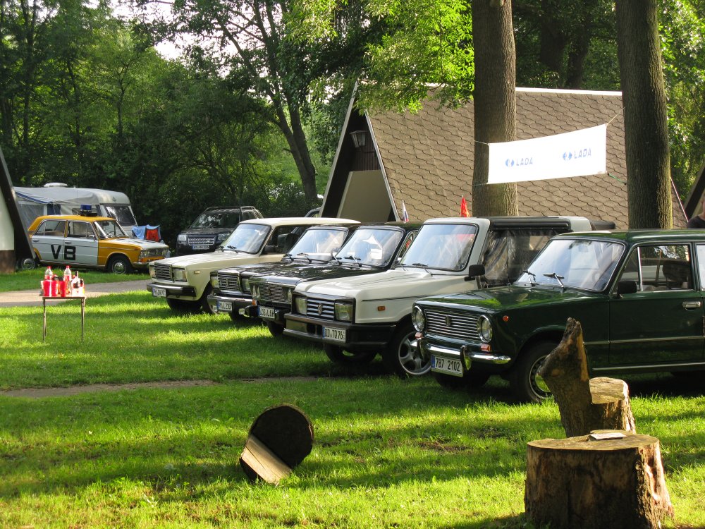 Umýt, převléci, a rychle na velké venkovní posezení organizované vybranou cateringovou společností. Podávala se vynikající duryňská specialita, zvaná Mutzbraten. Trochu se podobala českému vepřo-knedlo-zelo, ale bez knedla, a vepřo bylo na grilu. Noo – mňam, masíčko i zelí vynikající chuti, a v množství doslova neomezeném!!! Zapili jsme tu dobrou krmi lahodným pivkem a to už se chystala další akce. Prezentace místní vinařské firmy s komentovanou degustací. Všechny degustované vzorky z oblasti Saale-Unstrut byly provázeny zajímavým odborným výkladem, do něhož se často zapojovali se svými všetečnými dotazy a názory i někteří z našich účastníků. Bylo to zábavné, ale když se konečně dostalo na červená vína, přihlásila se… voda. Zase ten neodmyslitelný déšť. Takže poslední dva vzorky jsme probrali (a vypili) trochu rychleji. Byly to ovšem všechno více než poctivé decky, kdo chtěl přidat, dostal, a na závěr se ještě zájemcům rozlilo vše, co zůstalo otevřené. Rád jsem využil i nabídky k nákupu vína za skutečně neobchodní cenu, a pořídil několik lahví dobrého moku domů. Zatímco cateringová i vinařská firma vyklidily pole, uvolněná nálada u improvizované dlouhé tabule z našich kempingových stolků a stolů všeho druhu dlouho odolávala drobnému dešti. Teprve s příchodem tmy, hromů a blesků se účastníci nakonec rozešli, dílem do kiosku, dílem do chatek. Po celou dobu budila obzvláštní pozornost přítomných Viktorova vébácká nulatrojka, zaparkovaná v blízkosti, a tak někteří (viď, Jane?) zkoušeli její zařízení až do noci. Dá se to pochopit, protože většina účastníků srazů německého Lada-Welt u nás ještě nebyla, a tak tato auta nezná. Vozy v úpravě Volkspolizei z doby NDR jsou v Německu taky vzácné a spíš, než na Lada srazech, je lze spatřit na akcích jako Ostalgie Magdeburg apod.