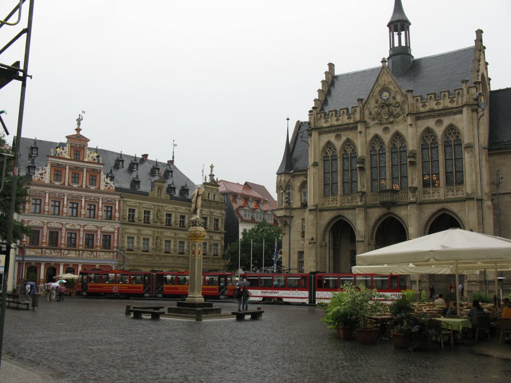 Erfurt je, zejména pro Brňáka, velmi příjemným městem. Věže Dómu a kostela sv. Severina, spolu s Citadelou Petersberg na nedalekém návrší, vytváří dojem katedrály sv. Petra a nedalekého hradu Špilberk v moravské metropoli. Kolo ve znaku, spolu s červeno-bílou barevnou kombinací a šalinami v centru města tento dojem jen dotvářejí. 🙂