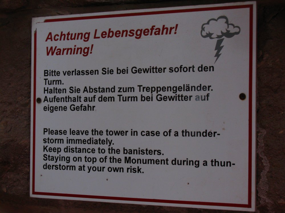 Počasí je jen tak-tak, po pár krocích z parkoviště se snáší drobný déšť. Nedosti na tom, po výstupu do areálu památníku se povětří zhoršuje a na vyhlídce shora je už vidět blížící se rozsáhlá bouře. Jak jinak taky. Obcházíme a fotíme monument i sousední středověkou věž a s příchodem prvních spršek bouřky se ukrýváme uvnitř památníku. U vchodu sice visí výstražná cedule, že za bouřky je vstup na ochozy na vlastní nebezpečí, jenže náš výstup se 247 schody, fotografováním a nakukováním z ochozů je pomalejší, než bouře. Ta se mezitím s duněním a prudkým lijavcem přehnala okolo, a tak nahoře už nás zdraví slabé sluníčko.