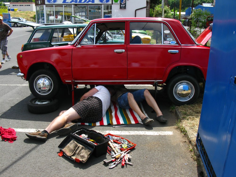 5. Nikdo z nás prostě pana šéfa neoblomil, ani když z okna viděl výpravu 4 veteránů, na kterou se v Německu čekalo. Zatímco on v klidu kamsi odjel se svojí dosti zanedbanou 2111, vybalili jsme tedy svůj vercajk a před prázdným servisem s lelkujícími zaměstnanci zahájili operaci výměny hardy-spojky na asfaltu. Inu, šlo to na vytvořeném provizoriu ze dvou heverů a podložené rezervy ztuha, v potu a nepohodlí, ale nakonec jsme, navzdory pálícímu slunci a teplotě 35°C ve stínu, slavili po necelých dvou hodinách vítězství. Jako bonus jsme si mohli po práci umýt ruce na WC servisu naší vlastní solvinou.